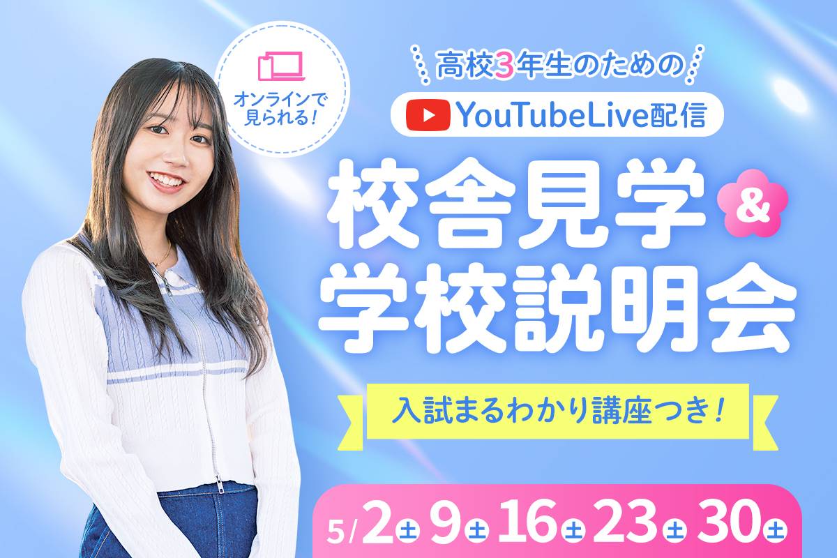 これから進路選びを始める高校生のためのYouTubeLive配信での校舎見学&学校説明会を実施します! 2部には総合型選抜(AO入学)エントリー丸わかり講座も配信します!1部のみ、2部のみの視聴もOKです!お気軽にご予約ください。